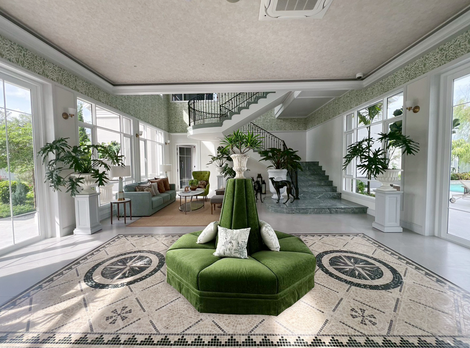 Chatuchot clubhouse by Sansiri, Bangkok. An elegant lakeside retreat that balances strength with ethereal beauty, where rich, warm textures create a sense of grounded luxury. Layers of natural materials are complemented by an accent palette of verdant greens in varying depths and tones—evoking the shifting hues of water, foliage, and light. The atmosphere is at once serene and opulent, a place where nature’s tranquility meets refined design.